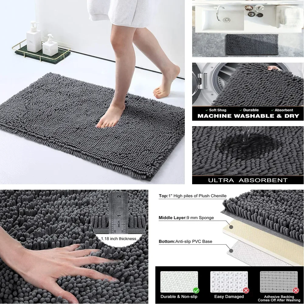 Chenille Soft Plush Bath Mat Super Absorbent Washable Non Slip Bathroom Comfortable Carpet for Shower Toilet Doormat Floor Rugs