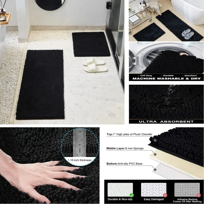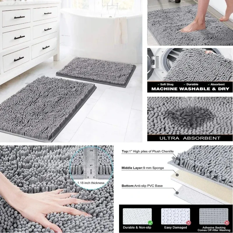 Chenille Soft Plush Bath Mat Super Absorbent Washable Non Slip Bathroom Comfortable Carpet for Shower Toilet Doormat Floor Rugs