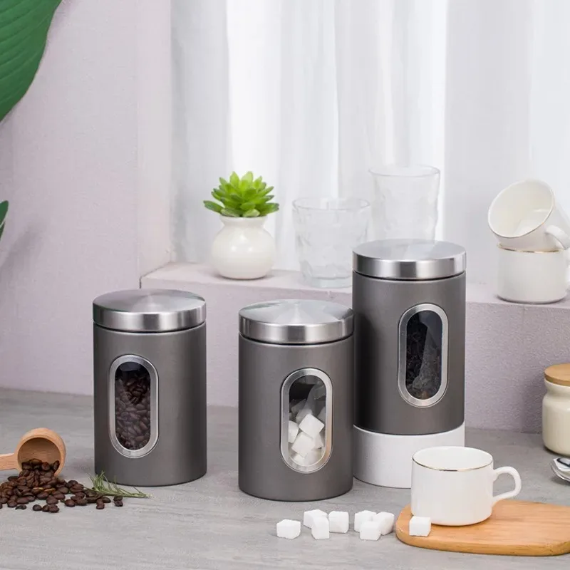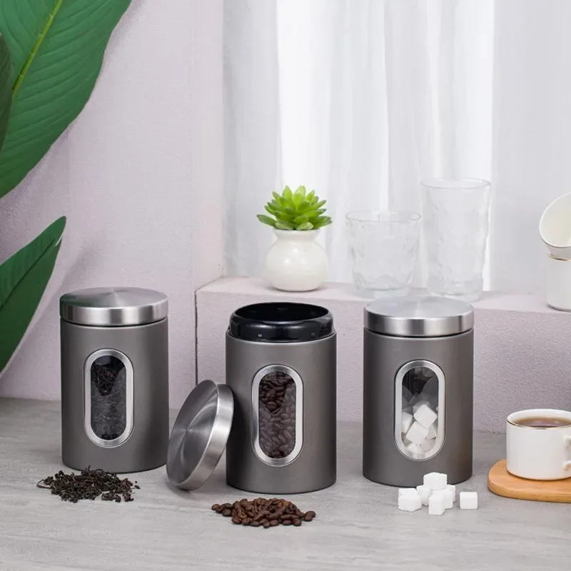 Kitchen Visual Window Storage Jar Coffee Bean Sugar Tea Storage Food Grade Silver Gray Stainless Steel Sealed Jar